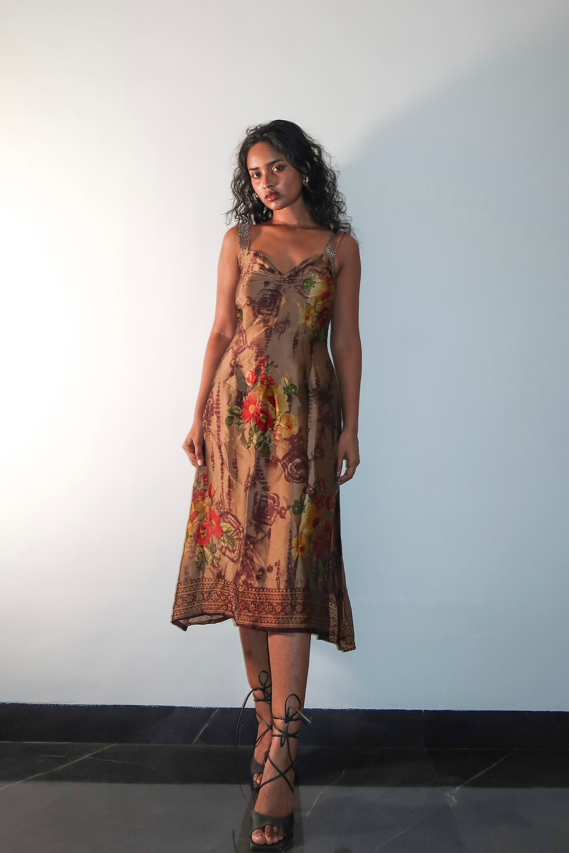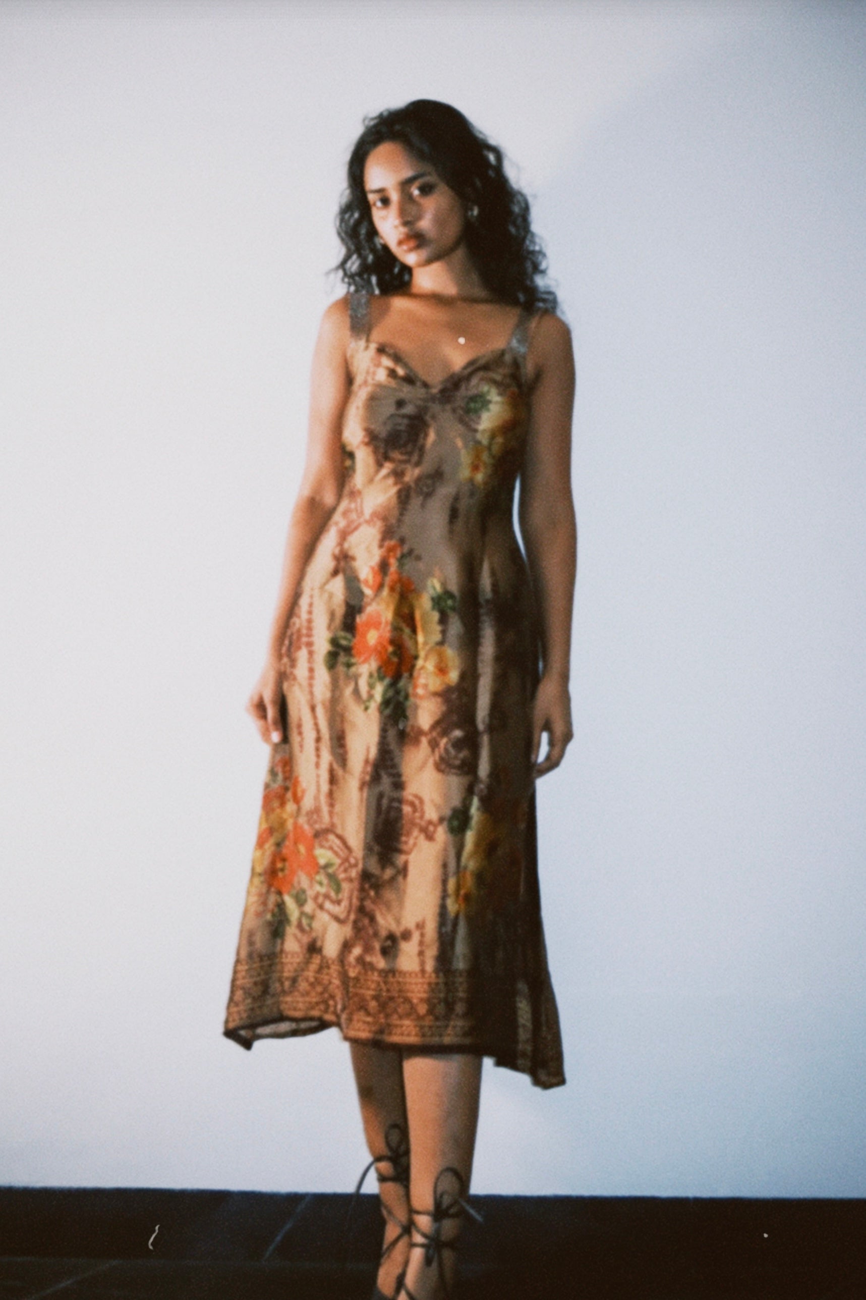Backless corset style tie details, midi length feturing lace shoulder straps.
