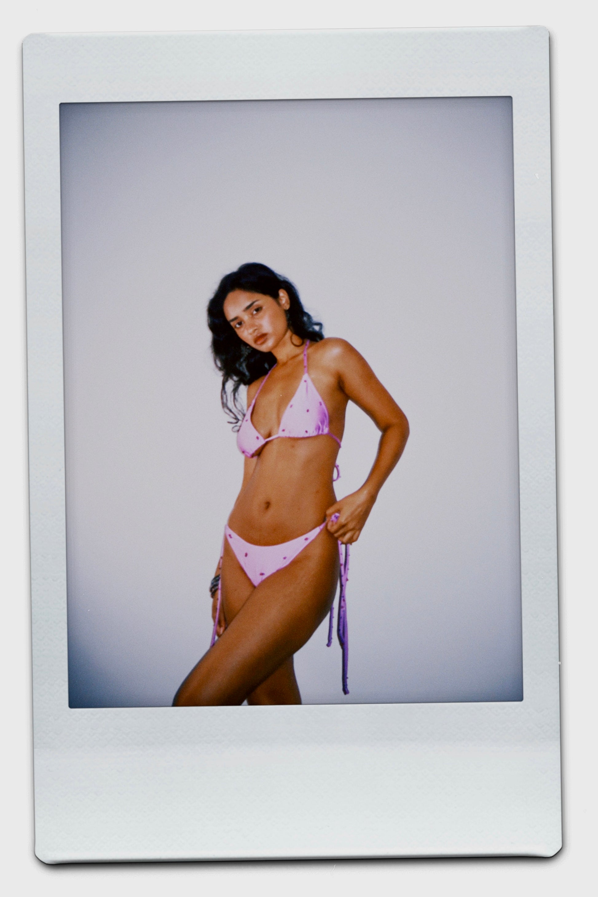 Triangle bikini tie bottoms featuring hand embroidered details with dequins and beads.